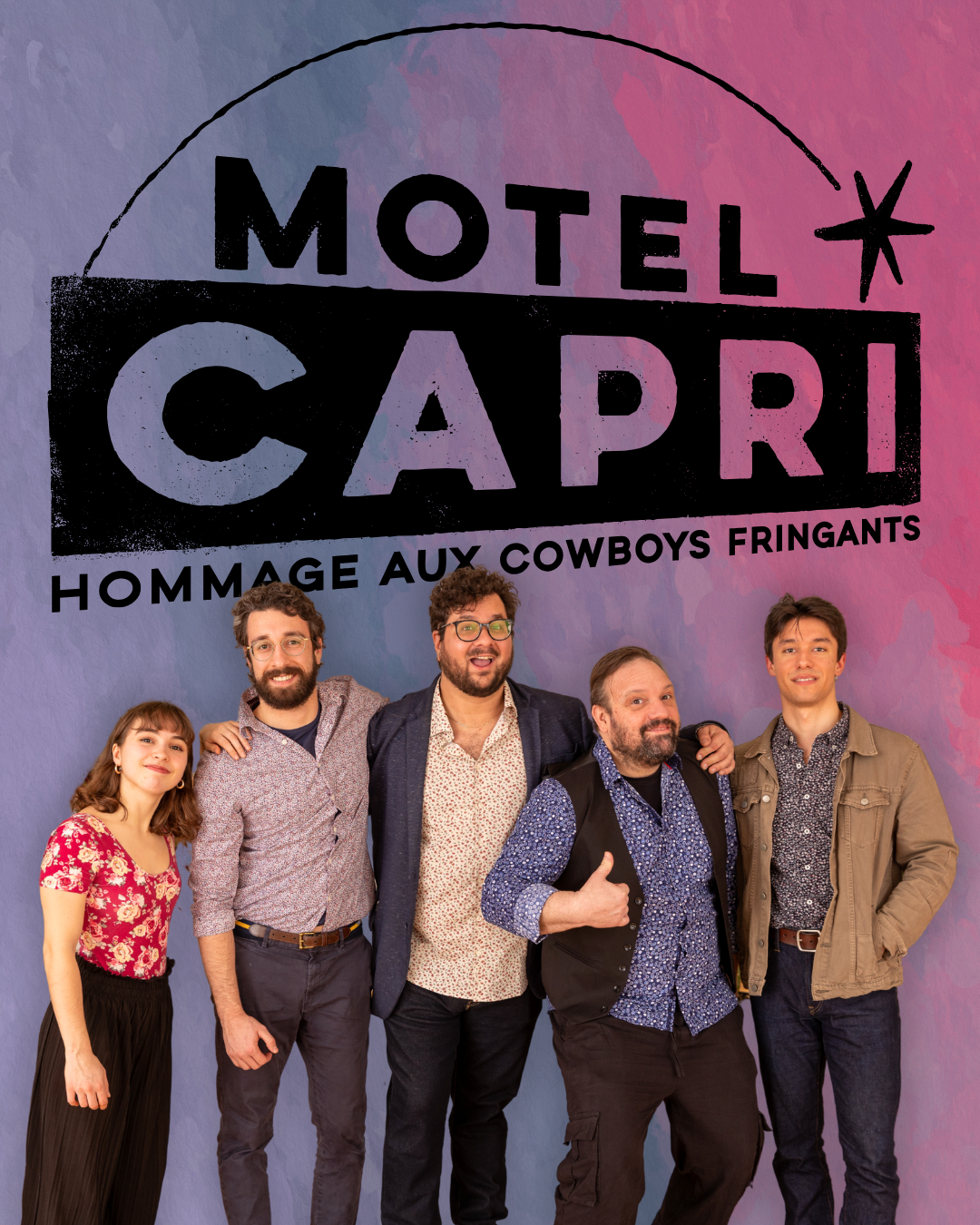 Motel Capri est un groupe hommage aux Cowboys Fringants qui incarne l’énergie et la poésie de ce groupe culte québécois. Formé par des musiciens passionnés, Motel Capri transporte son public dans un univers où folk et paroles engagées se rencontrent. Avec un répertoire soigneusement choisi, le groupe recrée fidèlement l’ambiance unique des spectacles des Cowboys Fringants, tout en ajoutant sa propre touche d’authenticité.